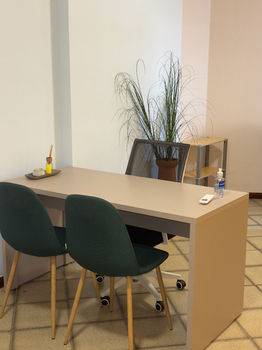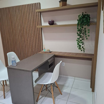 Consultório aconchegante, climatizado e com isolamento acústico. A mobília específica inclui duas poltronas, mesa e cadeiras para o profissional e paciente. A sala dispõem ainda de toalete.