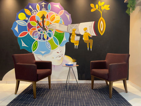 Consultório aconchegante, climatizado e com isolamento acústico. Mobília e decorações versáteis para atendimento iinfanto-juvenil e adulto.